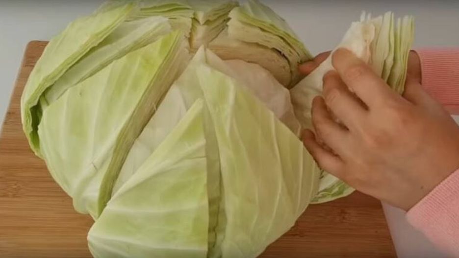Pokroiła kapustę w ten sposób, sparzyła i już po chwili zwijała mini gołąbki. Są obłędne