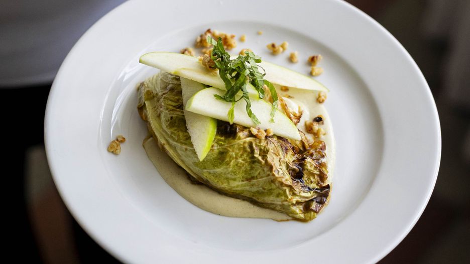 Kapusta pieczona z sosem soubise, jabłkiem i karmelizowanymi orzechami