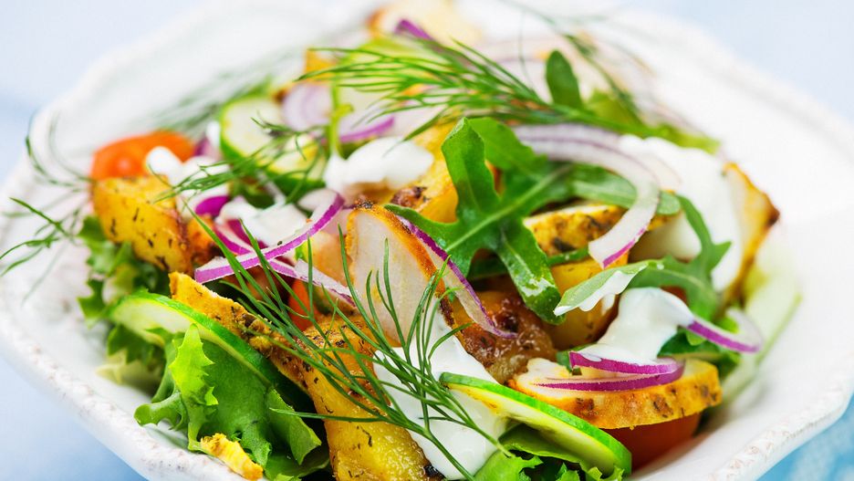 Ta sałatka ma wszystko to, co trzeba. Pieczone, młode ziemniaki sprawiają, że jest naprawdę sycąca, a pokrojone ogórki dodają lekkości. Całość możesz wzbogacić również ziołami, takimi jak świeży koperek, szczypiorek, natka pietruszki czy...mięta. Ta ostatnia doda ciekawą porcję dodatkowej lekkości całej sałatce.
