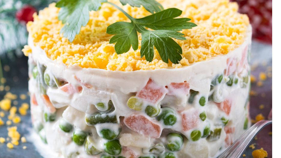 - Rozpocznij od rozmrożenia groszku. Filety z karpia usmaż na patelni, a następnie dokładnie sprawdź, czy nie pozostały ości, i pokrój mięso na małe kawałki. Marchewkę i ziemniaki ugotuj w lekko osolonej wodzie, a następnie pokrój w kostkę. Jajka ugotuj na twardo i również pokrój w kostkę.