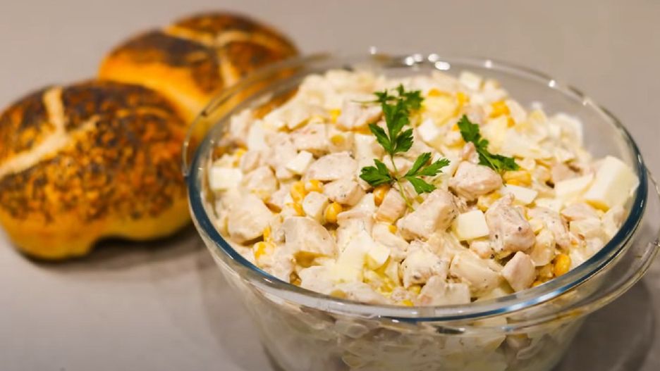 - W dużej misce połącz wszystkie przygotowane składniki: podsmażone kawałki kurczaka, jajka, pieczarki, paprykę, kukurydzę i cebulę.