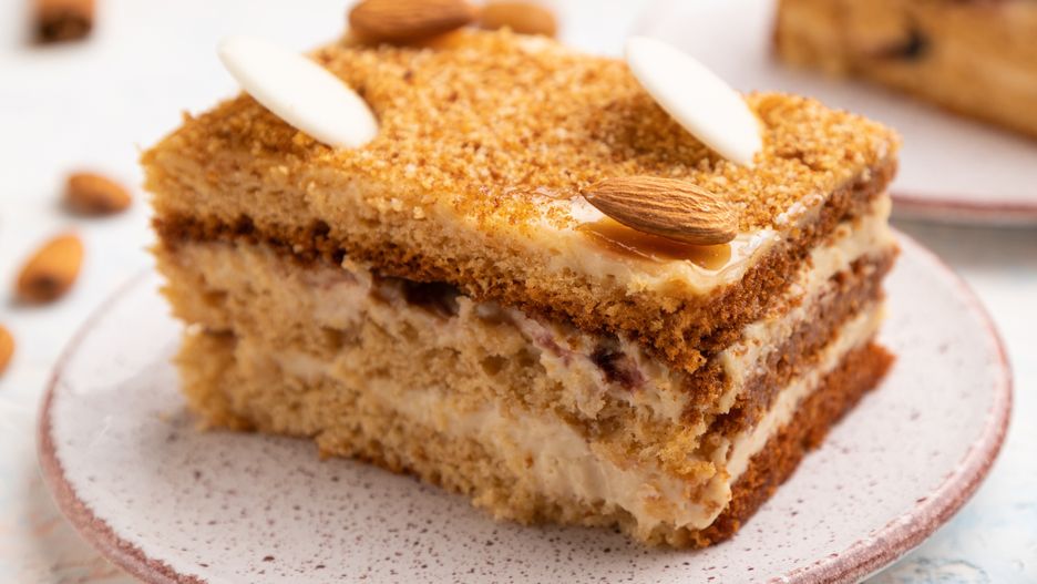Przepis na przekładany miodownik z kremem i migdałami