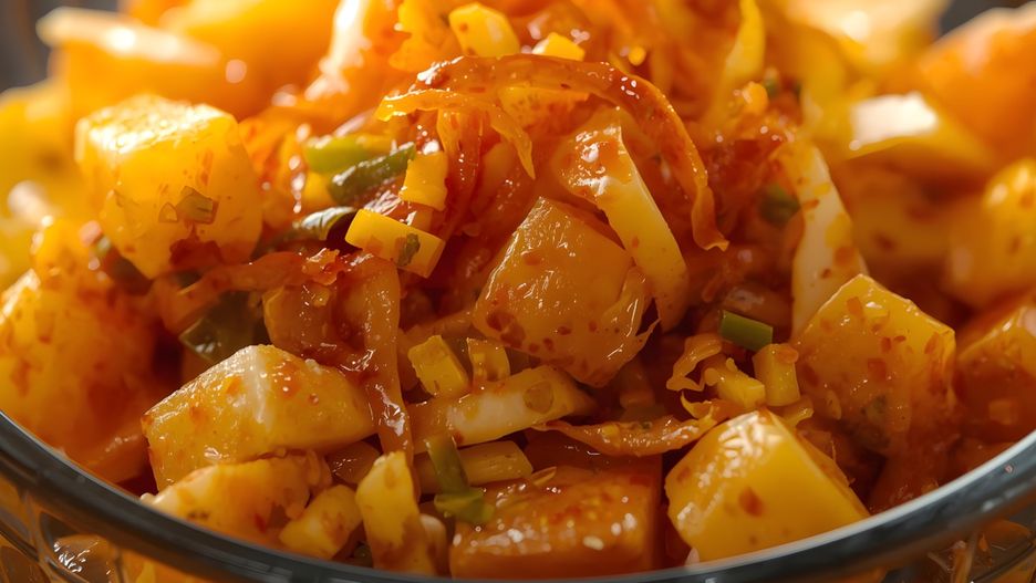 - Wymieszaj całość powolnymi ruchami, tak aby każda kostka ziemniaka pokryła się lśniącym, czerwonym dressingiem.