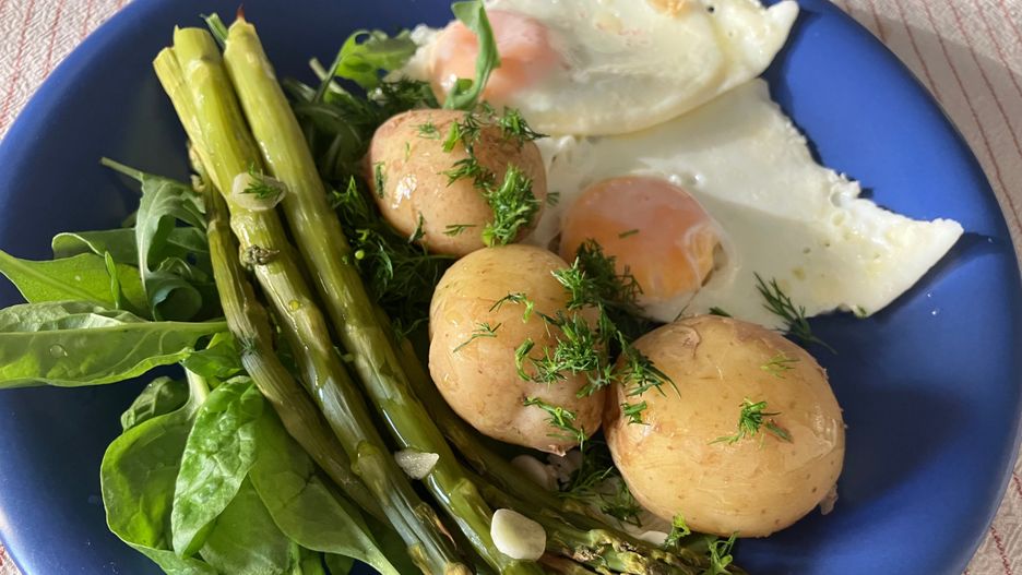 Długo czekałam na taki obiad – młode ziemniaki z masełkiem i koperkiem, do tego jajko sadzone i szparagi polane oliwą. Po zjedzeniu talerza pełnego sezonowych przysmaków czuję, że dbam o siebie. Chociaż ceny młodych ziemniaków mogą jeszcze odstraszać (u mnie po 12 złotych za kilogram), nie miałam wątpliwości, że to dobry wybór. Na szczęście szparagi spadły już do 10 złotych za pęczek, więc taki obiad nie wyczyścił mojego portfela.