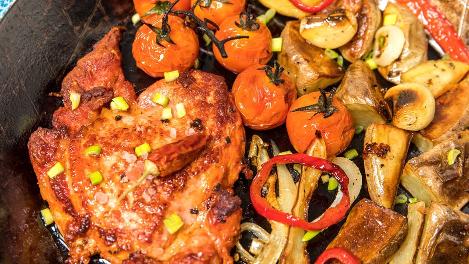 Poniżej wersja z pomidorkami, ziemniakami i marchewką, ale obok możesz położyć także inne warzywa. Jeśli masz ochotę na tradycyjny obiad, dodatki przygotuj osobno, a mięso zapiecz tylko z masłem i czosnkiem. Składniki w brytfannie podlej białym winem wytrawnym, a na dnie utworzy się przyjemny sosik.
