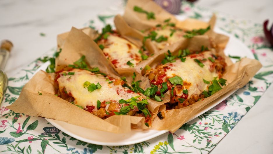 Krok 3. Na kawałku papieru do pieczenia ułóż udko, dodaj porcję warzyw, posyp serem i polej passatą. Tak samo zrób z pozostałymi kawałkami mięsa, każde na osobnym kawałku arkusza. Wstaw do piekarnika rozgrzanego do 170 stopni Celsjusza na 15 minut.