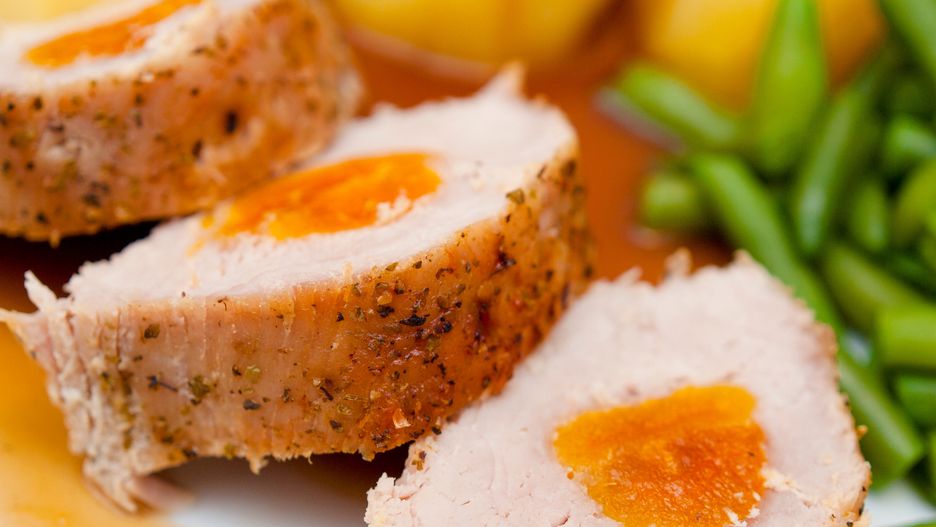 - Ostrym nożem przebij mięso, robiąc niewielki tunel w jego środku. W ten tunel powkładaj morele jedna za drugą.