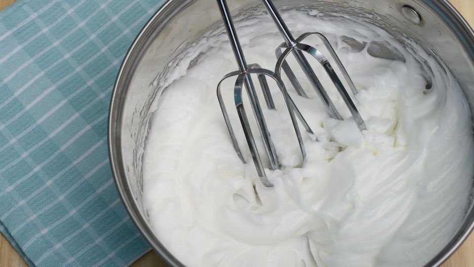 - Wlej płyn z ciecierzycy do dużej miski i ubijaj mikserem na wysokich obrotach, aż zacznie się pienić i zwiększy swoją objętość.