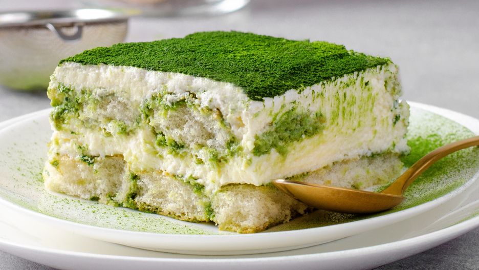 - Na wierzchu posyp deser matchą. Wstaw go do lodówki na kilka godzin, aby się dobrze schłodził.
