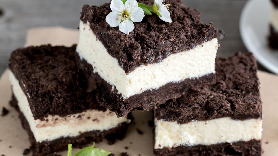 - Wyjmij z lodówki resztę ciemnego ciasta i rozkrusz je równomiernie na wierzchu sernika. Możesz to zrobić palcami, tworząc nieregularne kawałki.