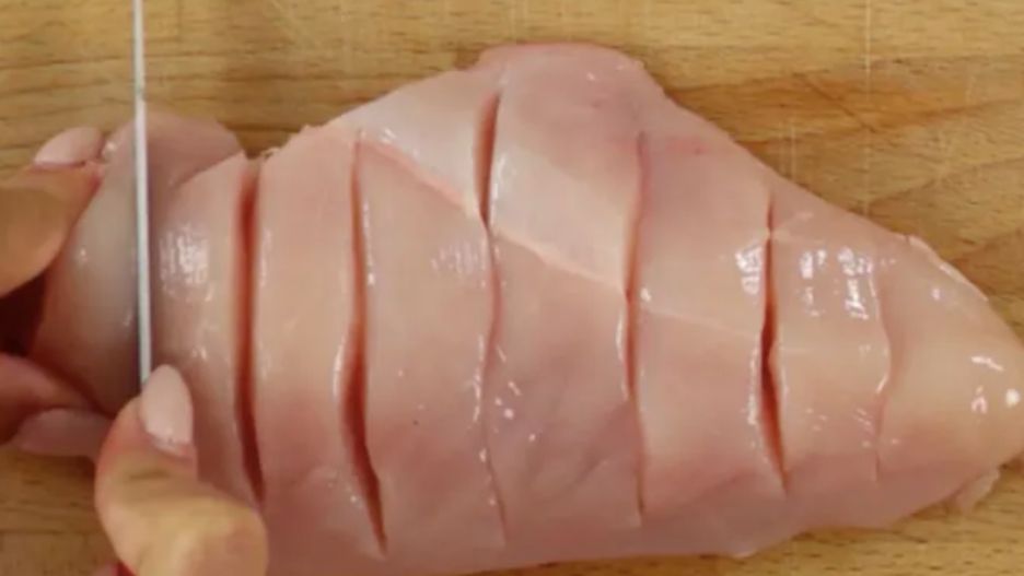 - Następnie ponacinaj każdą pierś w taki sposób, aby przez całą długość kurczaka powstały poziome kieszonki.