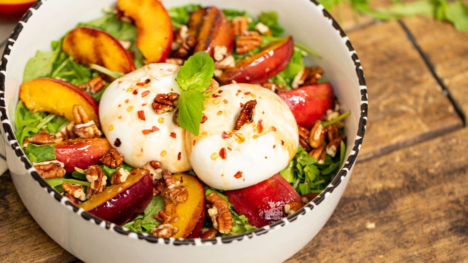 Połączenie słodkich, grillowanych nektarynek, kremowej burraty, orzechów i rukoli tworzy wyjątkowe danie. Orzechy pekan dodają sałatce chrupiącej tekstury, dzięki czemu każdy kęs to idealny balans między słodyczą i pikanterią oraz kremowością i chrupkością. Tutaj wszystko po prostu się zgadza.