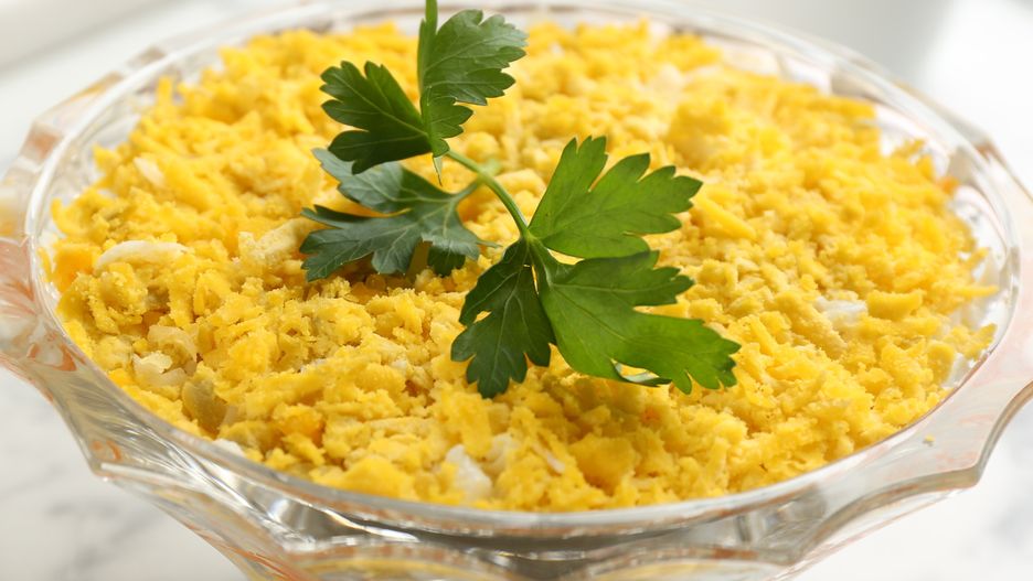 - Jajka ugotowane na twardo obierz i oddziel żółtka od jajek (jedno jajko możesz zostawić do dekoracji). Białka pokrój w kostkę, żółtka pokrusz dłońmi. Na groszku najpierw ułóż warstwę z białek, a następnie żółtek.