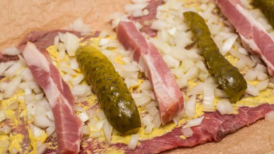 - Na każdym kawałku układam plasterek boczku, kawałek ogórka kiszonego i plaster cebuli, a następnie zawijam mięso, formując zrazy.