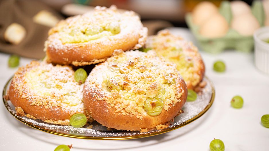 Agreścianki to puszyste drożdżówki z budyniem, kwaśnym agrestem i chrupiącą kruszonką. Idealne na letni podwieczorek! Ciasto wyrasta 1,5 godziny, a potem piecze się przez 20 minut w 185°C. Z jednej porcji wychodzi 6 sztuk – idealnych do kawy lub na wynos.