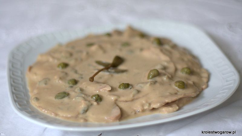 Cielęcina w sosie tuńczykowym, czyli vitello tonnato. Gotowana cielęcina w sosie z tuńczyka z puszki z kaparami, sardelami i oliwą. Obecnie bazę do sosu stanowi majonez, jednak pierwotnie sos pozbawiony był żółtek, a co za tym idzie, nie był przyrządzany na bazie majonezu. Przepis na ten włoski klasyk przetestowała w swojej kuchni Joanna autorka bloga "Królestwo garów".