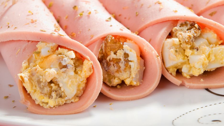 - Na plastry szynki wykładaj porcje przygotowanej sałatki jajecznej i zawijaj w rulon.