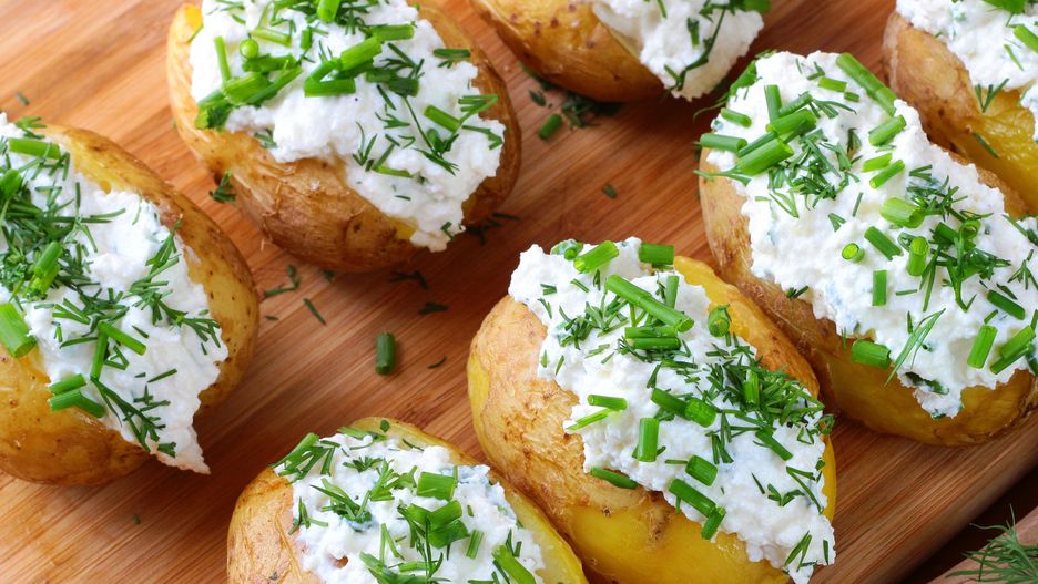 - Wyjmij wcześniej przygotowany twarożek z lodówki i porcjuj do środka ziemniaków.