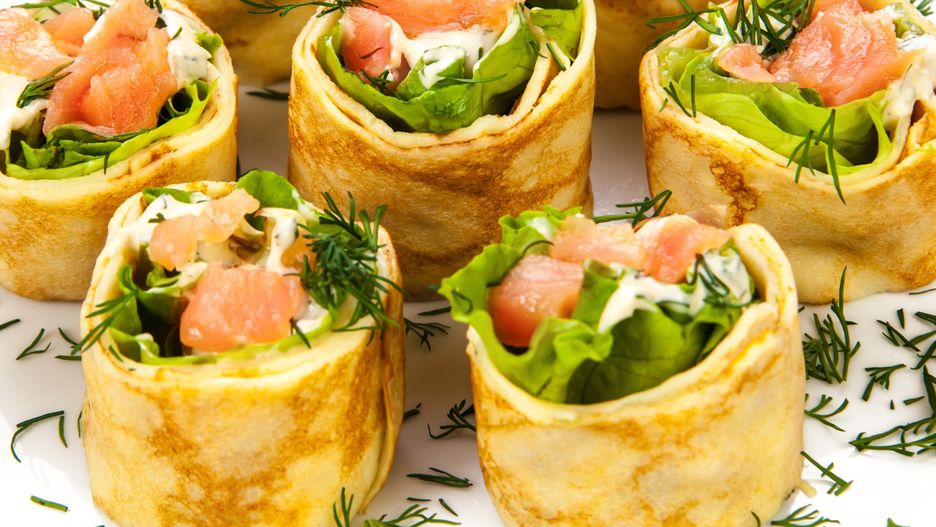- Gotowe naleśniki posmaruj serkiem, ułóż kawałki łososia i zwiń w rulony.