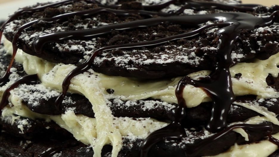 Naleśniki oreo z cukrem pudrem i polewą czekoladową. Wyglądają obłędnie!