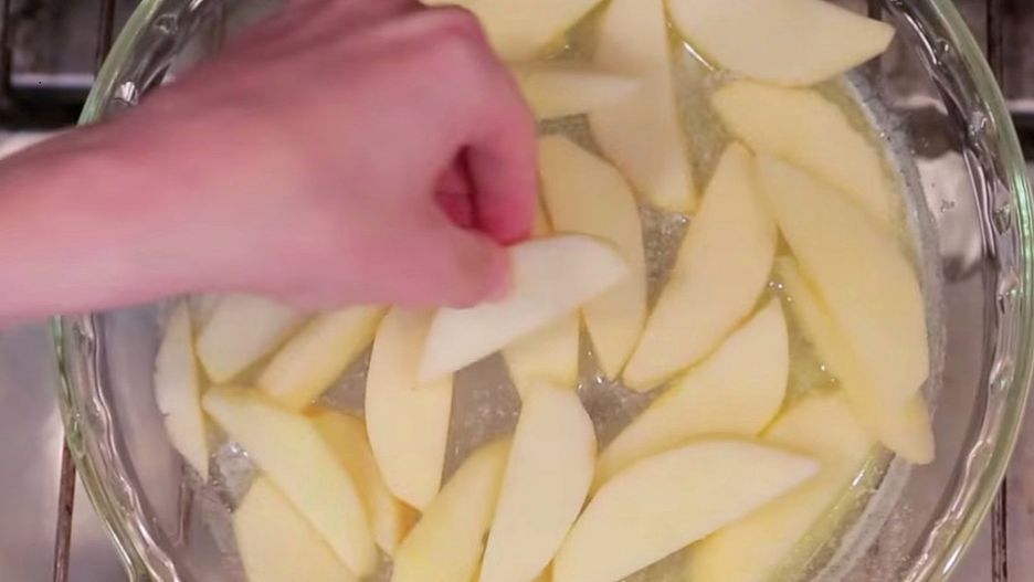 Rozgrzej piec do 220 stopni. W naczyniu żaroodpornym umieść masło i włóż je do pieca. Niech się roztopi. Dodaj po chwili pokrojone w plasterki jabłka.