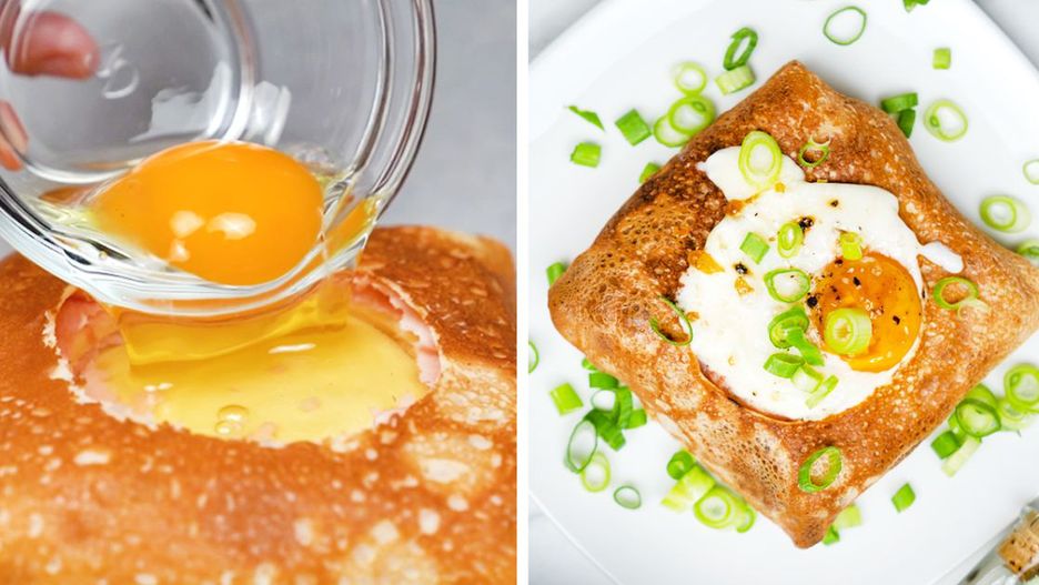 Naleśniki z jajkiem, szynką i żółtym serem. Idealne na każdy posiłek w ciągu dnia