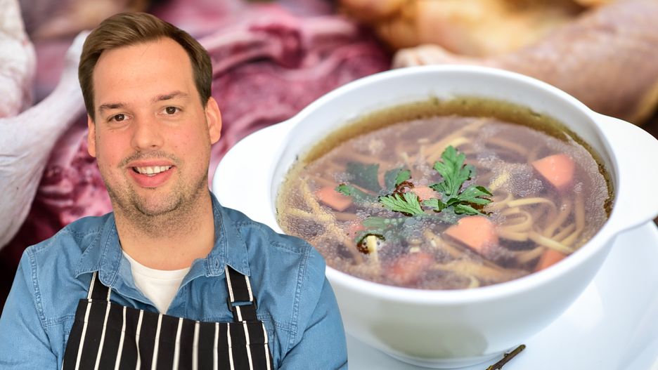 Jakub Kuroń: Przy takim wyborze, mamy konkret, czyli dwie piersi oraz dwa udka. Zacznijmy jednak od — nie chcę brzydko mówić — odpadów, ale powiedzmy... tego korpusu i skrzydeł. Części gęsi, które tego mięsa zawierają dużo mniej. Najczęściej przygotowuję z nich buliony, które są wyjątkowo aromatyczne. Jestem fanem orientalnych wywarów, to znaczy z dodatkiem imbiru, trawy cytrynowej, czosnku i do tego jeszcze przyprawy tj. cynamon, kardamon oraz gwiazdki anyżu. I on ma taki posmaczek pięciu smaków, trochę takie gęsie pho bym powiedział, z szacunkiem dla oryginalnego pho oczywiście. To taka moja wariacja, orientalny rosół, który jest mocno rozgrzewający. Czy go podamy z pszennym makaronem, czy z ryżowym, ale na pewno z poszarpanymi resztkami mięsa z tego korpusu i skrzydełek, to wychodzi bardzo fajny rosół, ale o takim orientalnym z lekka aromacie.