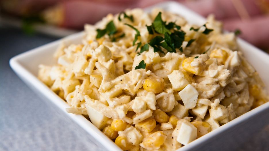 Pierś z indyka (300 g) kroimy w kostkę, obsypujemy przyprawami (solą, pieprzem, słodką papryką, suszonym czosnkiem, curry) i odstawiamy na godzinę do lodówki. Następnie smażymy i studzimy. Równocześnie gotujemy makaron kokardki (100 g), który także odstawiamy później do przestudzenia. Oba składniki przekładamy do miski, dodajemy pokrojone na pół fioletowe winogrona (bezpestkowe) oraz kukurydzę z puszki. Mieszamy z majonezem, na koniec posypujemy podprażonymi pestkami słonecznika oraz posiekaną natką pietruszki.