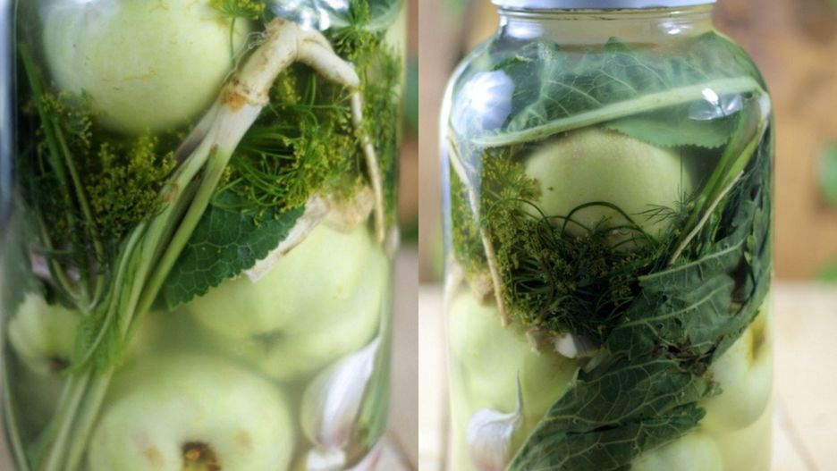 - Koper opłukać, czosnek obrać. Na dnie naczynia ułożyć 2 gałązki kopru, wrzucić kilka ząbków czosnku. Ułożyć jabłka. Włożyć chrzan, liść chrzanu, pozostały czosnek i koper.