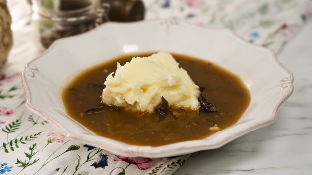 - Gotową zupę podawaj z tłuczonymi ziemniakami, które powinny znaleźć się w talerzu na samym środku przed wlaniem zupy. Stąd nazwa "ziemniaczana wyspa". Aby były one idealnie kremowe, dodaj do nich trochę masła z mlekiem lub śmietankę.