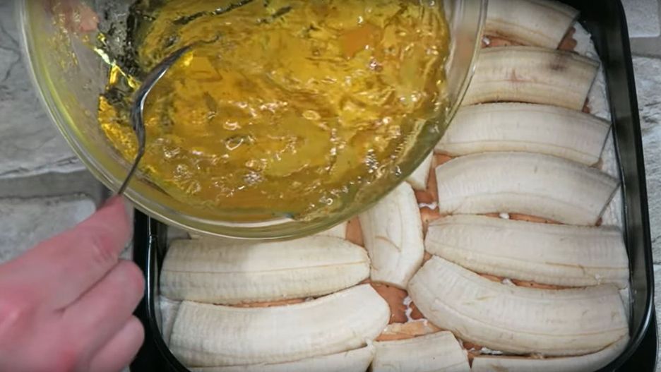 Tak przygotowany krem, należy wyłożyć na herbatniki i następnie przykryć kolejną porcją tych ciastek. Wstawiamy ciasto do lodówki i bierzemy się za kolejne składniki. Galaretki należy rozpuścić w gorącej wodzie i odstawić do wystudzenia i stężenia. Na herbatniki układamy przekrojone wzdłuż banany i zalewamy tężejącą już galaretką. Ponownie wstawiamy do lodówki. Czas na bitą śmietanę. W tym celu żelatynę należy zalać zimną wodą i poczekać do napęcznienia. Następnie należy podgrzać ją w mikrofali lub w garnuszku, by się rozpuściła.