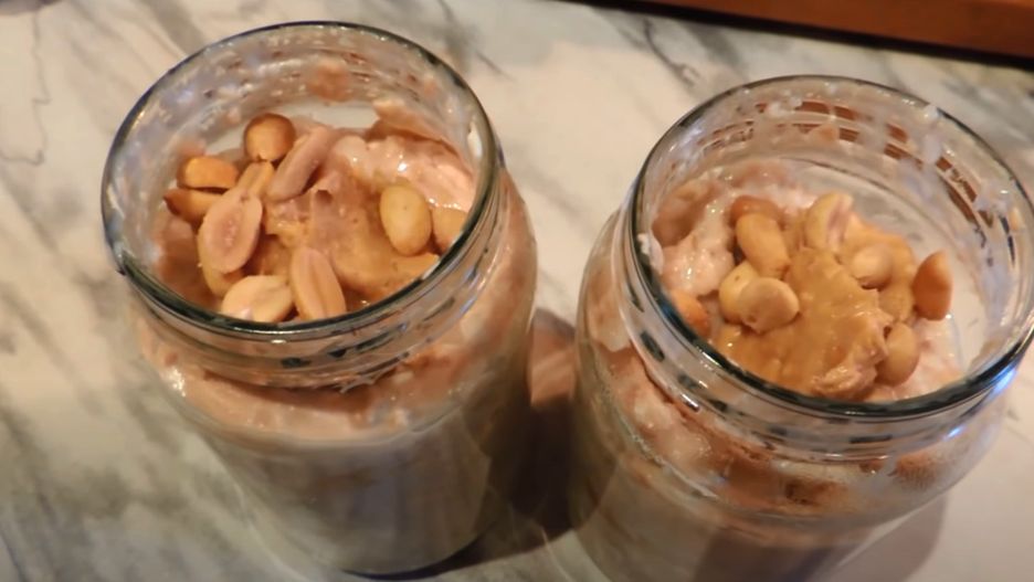 Teraz zalej płatki owsiane wodą. Dodaj kakao, krem orzechowy, jogurt, orzeszki ziemne, pokrojonego daktyla i erytrytol (jest to rodzaj słodzika, który na ten moment uznawany jest za najzdrowszy możliwy zamiennik dla cukru). Całość wymieszaj, przykryj i odstaw na noc do lodówki.