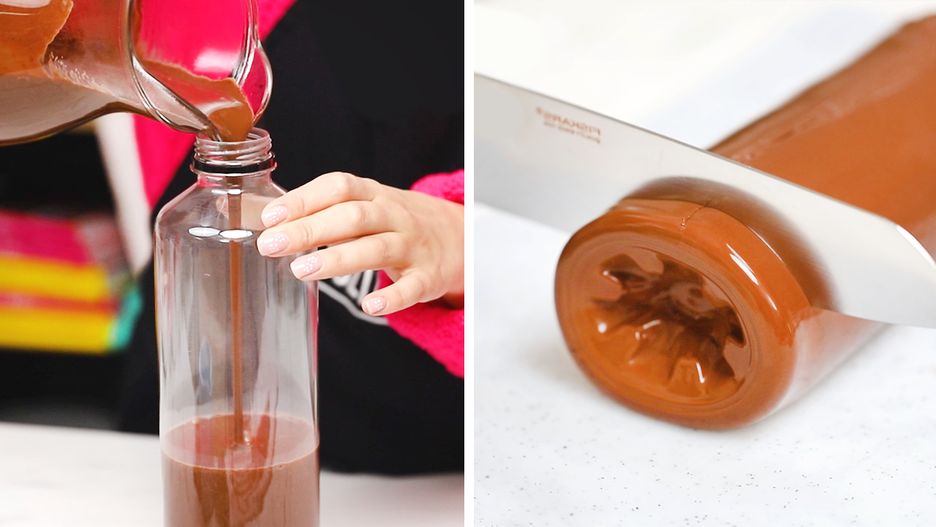 Krok 2: Powstałą masę czekoladową przelewam do butelki. Jeśli jest ona wykonana z cienkiego plastiku, koniecznie poczekaj, aż nieco przestygnie. Butelkę z czekoladą wstaw do lodówki na minimum 3 godziny.