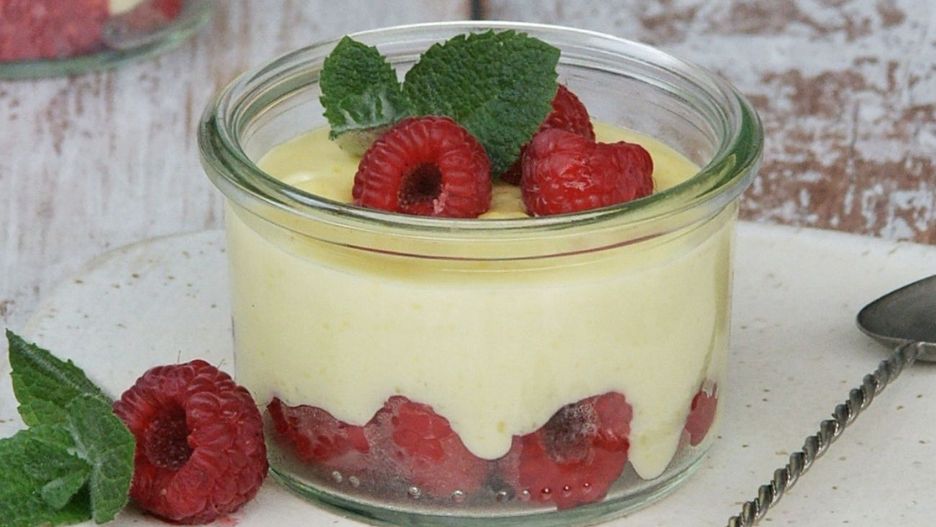 - Do miseczek wsyp maliny, wlej krem.