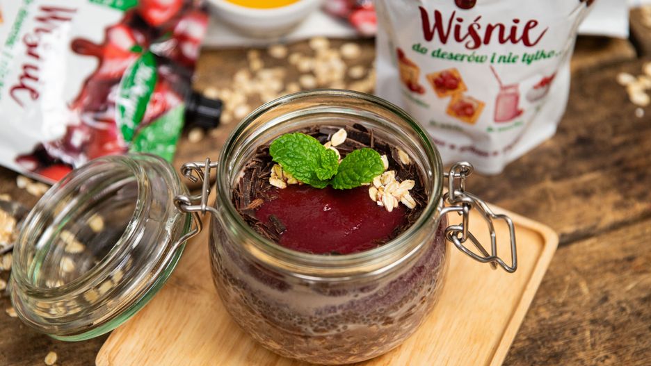 Idealnym rozwiązaniem w tym przypadku jest nocna owsianka, którą przygotujesz dzień wcześniej w dosłownie kilka minut. Taki posiłek wstawisz do lodówki na całą noc, a rankiem nie pozostanie już nic innego, jak zajadać się pysznym śniadaniem. Idealną kombinacją, której nie możesz wręcz przegapić, jest połączenie czekoladowej owsianki z pysznym musem owocowym o smaku wiśni. Już po pierwszej łyżce znajdziesz się w siódmym niebie. Jest tak pyszna!