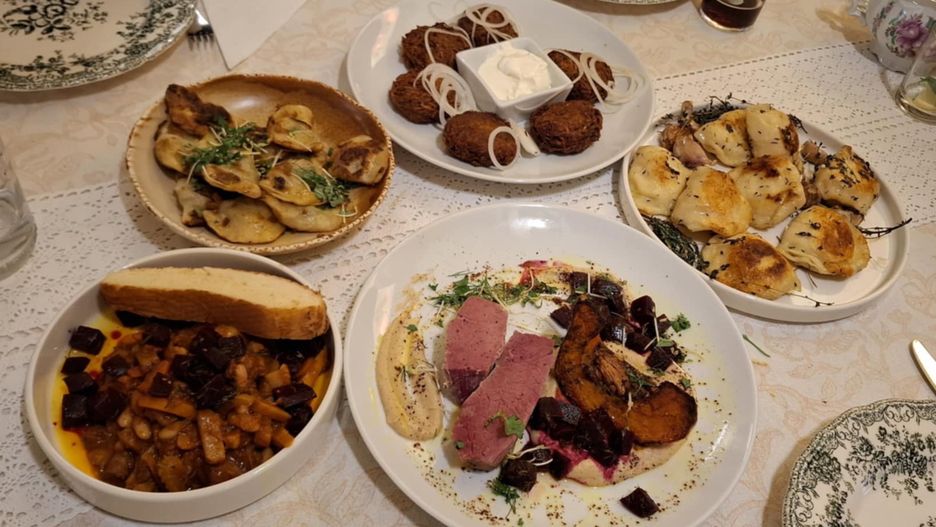 Mieliśmy również okazję spróbować salt beef, czyli wołowiny peklowanej według przepisów z kuchni żydów z Europy środkowo-wschodniej, którzy wyemigrowali do USA. Mięso było kruche, rozpadało się pod widelcem. Na stole pojawiły się też latkes chanukowe, czyli placki ziemniaczane smażone na złoto, były przyjemnie chrupiące i podane z odrobiną śmietany. Wieczór dopełniły dania z szabasowego menu, przygotowywane zgodnie z tradycją. Wśród nich - czulent po lubelsku z wołowiną i pierogi z gęsiną.