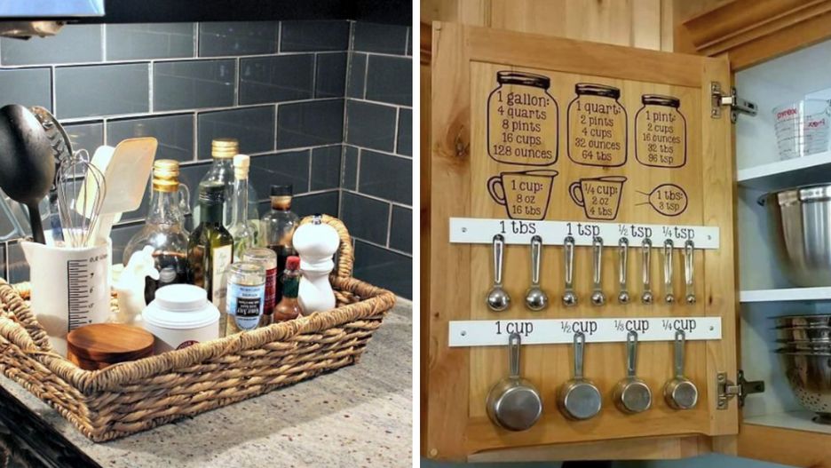 Zamiast trzymać wszystkie miarki w jednej szufladzie, w której prędzej czy później, robi się bałagan, postaw lepiej na moją metodę. Użyj wewnętrzną części szafki kuchennej do przechowywania wszystkich miarek. Wystarczy zawiesić je na małych haczykach z opisami.