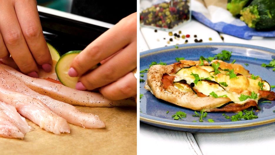 Tak przygotowaną pierś przełóż na blaszkę wyłożoną papierem do pieczenia i rozłóż nacięte paski. Między kawałki mięsa powkładaj plastry wędzonego boczku, plasterki sera i cukinii. Tak przygotowane mięso wstaw do piekarnika rozgrzanego do 180 stopni na 30 minut.