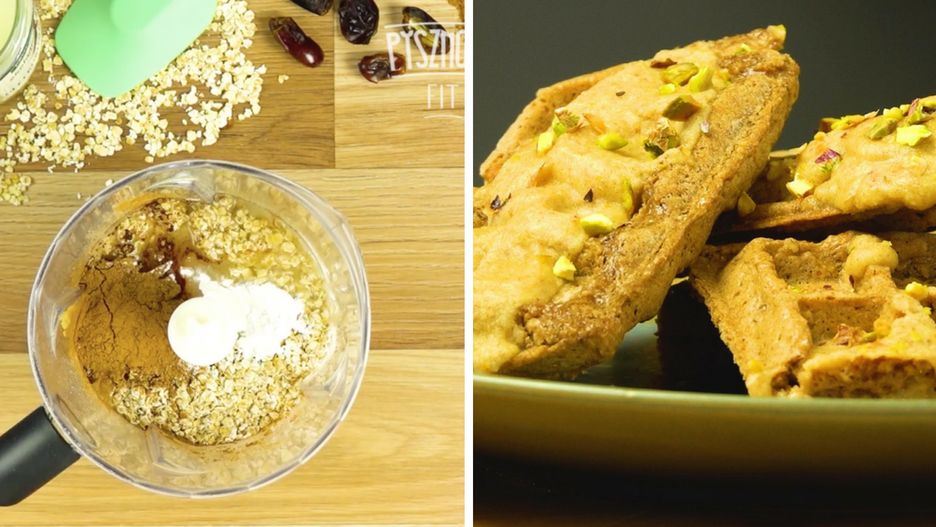2. W blenderze przygotuj ciasto na gofry. W tym celu połącz ze sobą: płatki owsiane, mleko, olej kokosowy, jajko, cynamon i proszek do pieczenia.