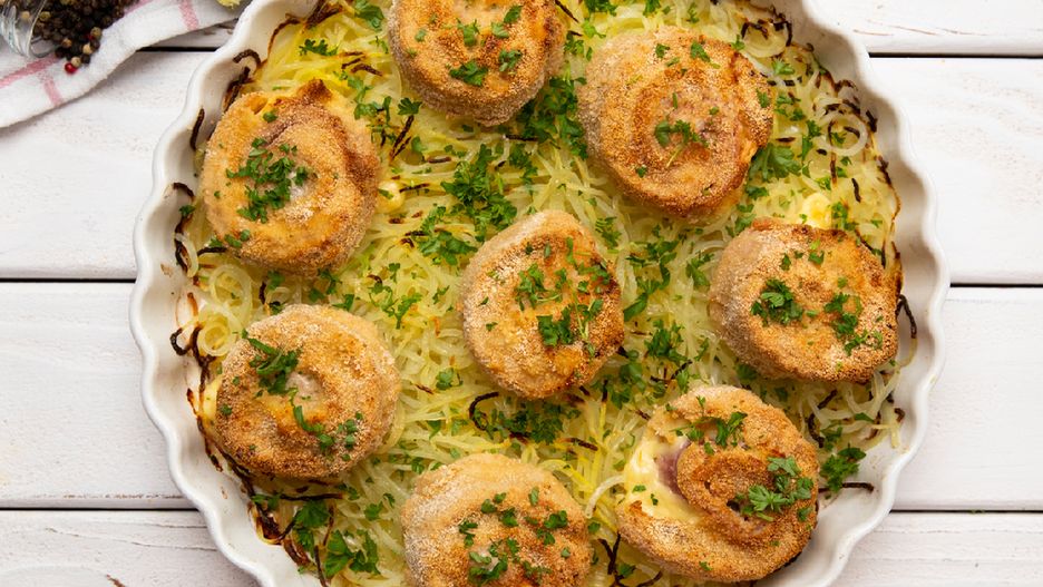 Panierowane roladki z indyka na zoodlowanych ziemniakch