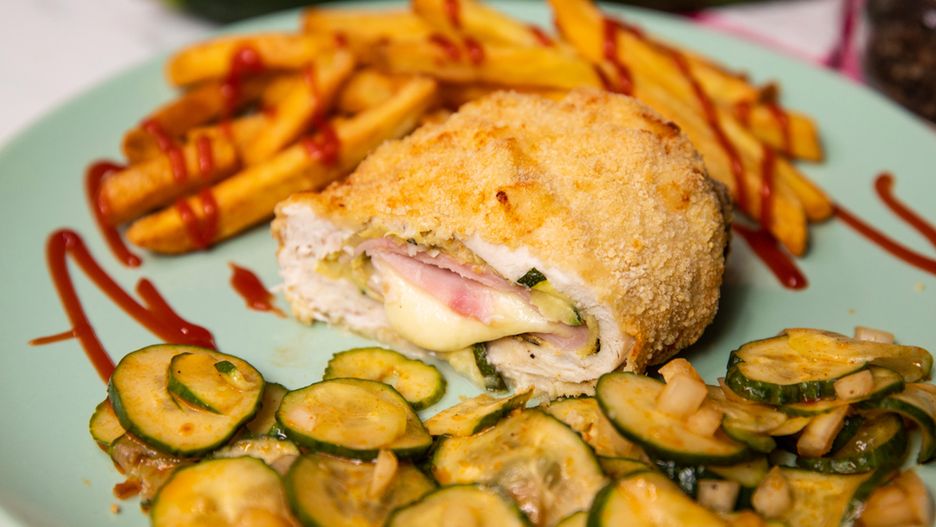 Panierowany filet z kurczaka skrywa w sobie same rarytasy. Tym razem postawiliśmy na kombinację szynki, cukinii i mozzarelli. Smakuje obłędnie 😉