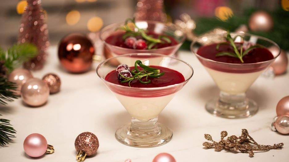 Panna cotta zamienia się w bożonarodzeniowy deser, dzięki żurawinowemu musowi. To idealnie zbalansowany deser, w którym słodki krem równoważy kwaśna żurawina.
