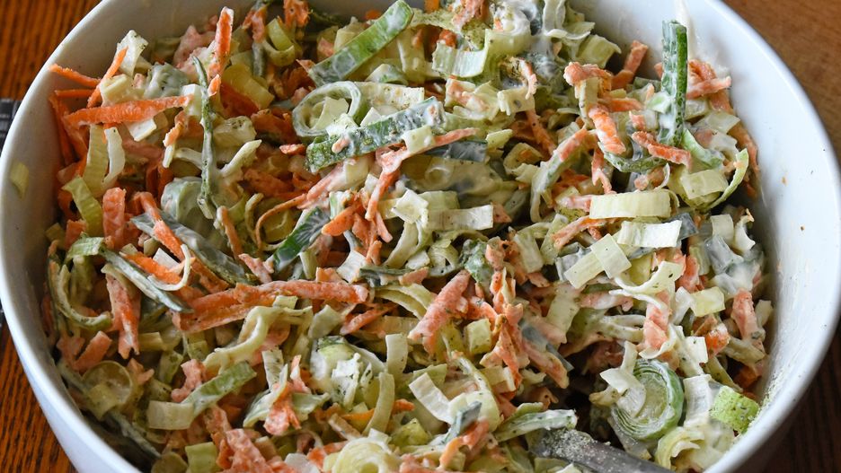 Surówkę porową najczęściej mieszamy z majonezem i kwaśną śmietaną, ale na Wielkanoc można dodać trochę chrzanu, który jest ważnym symbolem wiosennych świąt. Mocno pikantny korzeń potrzebuje równie solidnego zrównoważenia, stąd dodatek kremówki. Przetestowałam na innych rodzinnych uroczystościach – salaterki po surówce wracają wyczyszczone niemalże na błysk.