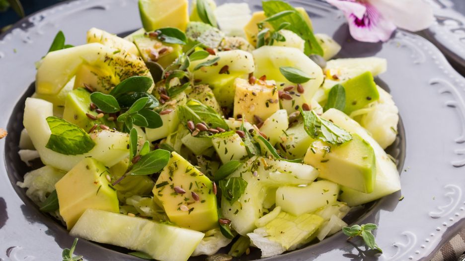 - Dodaj pokrojone w kostkę awokado, dorzuć pestki słonecznika i garść świeżych ziół.