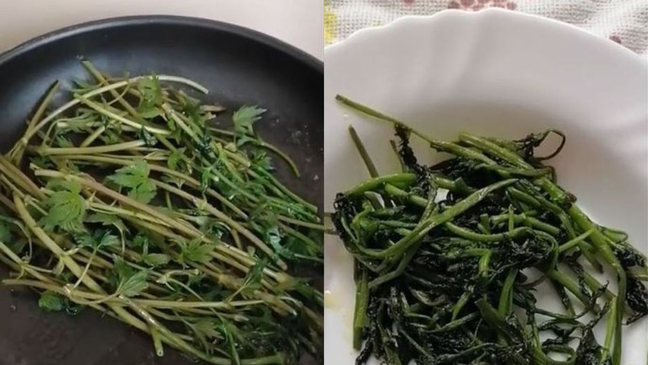 - Rozgrzej masło na patelni, wrzuć pędy chmielu i czosnek. Smaż przez około 5 minut, często mieszając. Przypraw solą i pieprzem pod sam koniec smażenia.
