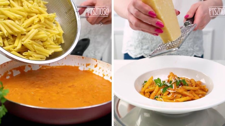 Połączenie składników i podanie penne alla vodka