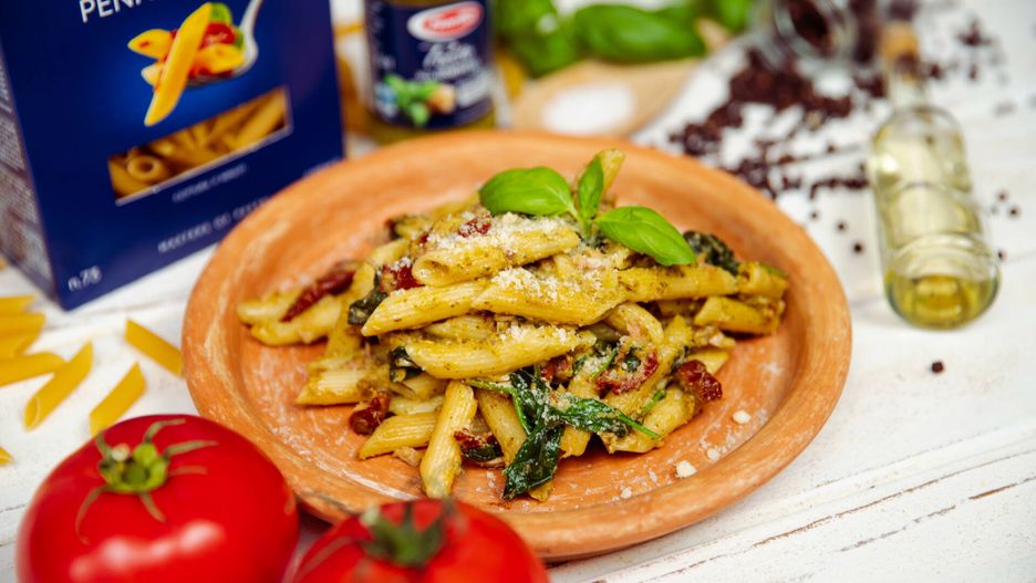 Najnowszy pomysł na pyszny obiad pochodzi z kuchni włoskiej, gdzie królują makarony. Sami nie potrafimy się im oprzeć, dlatego często je przygotowujemy. I wiemy doskonale, że Wy również macie do nich ogromną słabość, dlatego też jesteśmy pewni, że nasza propozycja z penne, zielonym pesto, tuńczykiem, szpinakiem i suszonymi pomidorami skradnie serce nawet największego niejadka od pierwszego kęsa. Wyczaruj genialną ucztę dla całej rodziny jeszcze dziś. Gwarantujemy, że na pewno nie pożałujesz!