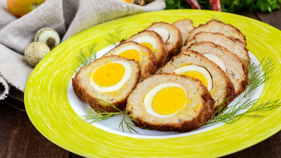 - 1/3 masy przełóż do foremki keksówki wysmarowanej olejem i delikatnie obsypanej bułką tartą (lub wyłożonej papierem do pieczenia). Na mięsie ułóż pośrodku w szeregu ugotowane jajka. Dołóż resztę masy mięsnej, formując górkę nad jajkami. Kilkukrotnie stuknij keksówką o blat stołu. Dzięki temu pozbędziesz się pęcherzyków powietrza. Pieczeń posmaruj rozbełtanym jajkiem. Piecz 50-60 minut w 180 stopniach C (grzanie góra-dół).