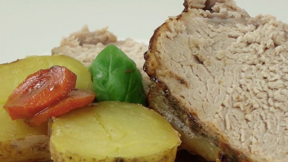 Pieczeń wieprzowa z jabłkami, ziemniakami i marchewką w aromatycznej marynacie