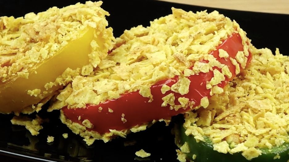 4. Po 1 godzinie, wyjmij krążki z zamrażarki. Każdy z nich namocz w jajku, a następnie posyp pokruszonymi chipsami tortilla. Przełóż krążki z powrotem na blaszkę i włóż do piekarnika rozgrzanego do 200 stopni C. Piecz przez 20 minut.
